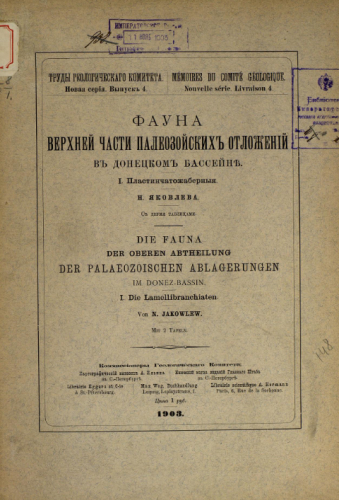 Труды Геологического комитета. Новая серия. Вып. 4 : Фауна верхней части палеозойских отложений в Донецком бассейне. [Ч.] 1 : Пластинчатожабренные / Н. Яковлев - Санкт-Петербург, 1903