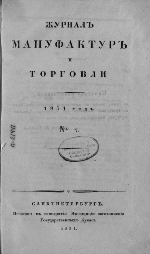 Журнал мануфактур и торговли. 1831, № 7. - Санкт-Петербург, 1831