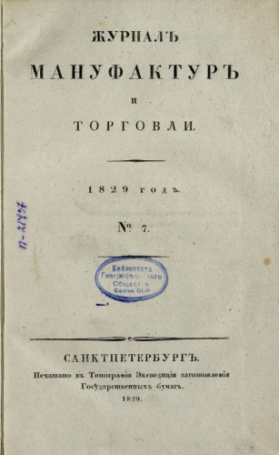 Журнал мануфактур и торговли. 1829, № 7. - Санкт-Петербург, 1829