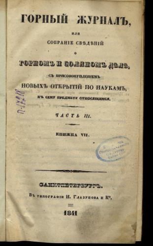 Горный журнал. 1841, Ч. 3. - Санкт-Петербург, 1841