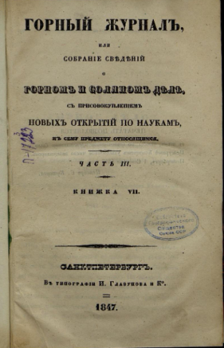 Горный журнал. 1847, Ч. 3. - Санкт-Петербург, 1847