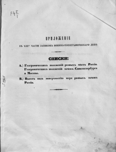 Записки Военно-топографического депо. Ч. XIII. Приложение : Списки : Геогр. положений разных мест России ; Геогр. положений точек Санкт-Петербурга и Москвы ; Высот над поверх. Моря разных точек России. - Санкт-Петербург, [1851]