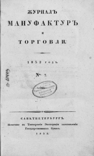 Журнал мануфактур и торговли. 1832, № 7. - Санкт-Петербург, 1832