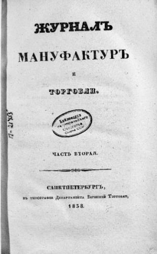 Журнал мануфактур и торговли. 1838, № 4. - Санкт-Петербург, 1838