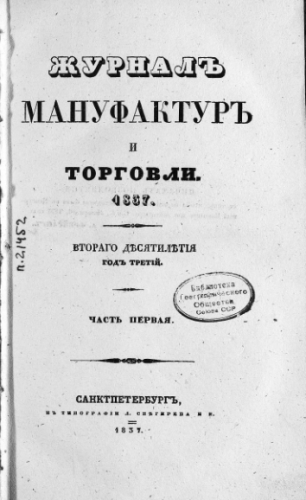 Журнал мануфактур и торговли. 1837, № 1-3. - Санкт-Петербург, 1837