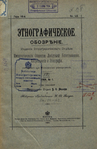 Этнографическое обозрение. 1904, № 1. - М. : Этнографический отдел Императорского Общества любителей естествознания, антропологии и этнографии, состоящего при Московском университете, 1904