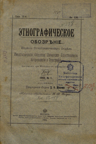 Этнографическое обозрение. 1903, № 1. - М. : Этнографический отдел Императорского Общества любителей естествознания, антропологии и этнографии, состоящего при Московском университете, 1903