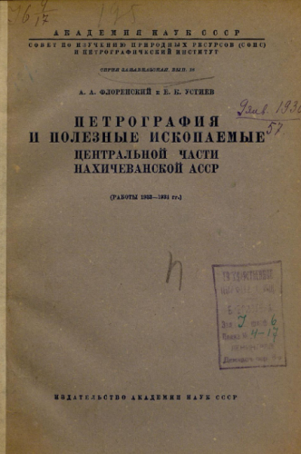 Труды Совета по изучению производительных сил. Серия Закавказская. Вып. 16 : Петрография и полезные ископаемые центральной части Нахичеванской АССР. (Работы 1933-1934 гг.) / А.А. Флоренский и Е.К. Устиев. - Москва ; Ленинград : Акад. наук СССР, 1935