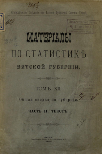 Материалы по статистике Вятской губернии. Т. 12, Ч. 2 : Общая сводка по губернии. Текст / Стат. отд. Губ. зем. упр. - Вятка : Вят. губ. земство, 1900