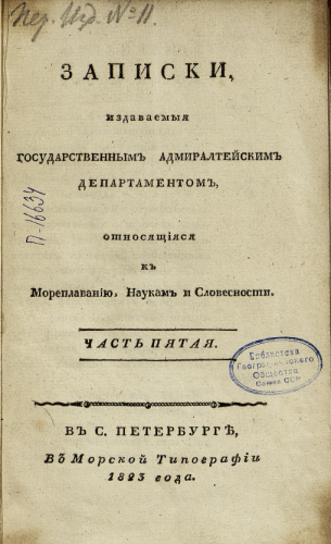 Записки, изд. Гос. Адмиралтейским департаментом, относящиеся к мореплаванию, наукам и словесности. Ч. 5. - Санкт-Петербург : Мор. тип., 1823