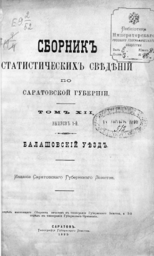 Сборник статистических сведений по Саратовской губернии. Т. 12, Вып. 1 : Балашовский уезд. - Саратов : Саратов. губ. земство, 1893