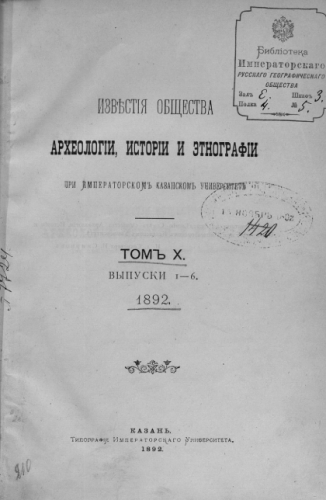 Известия Общества археологии, истории и этнографии при Имп. Казанском ун-те. Т. 10. - Казань, 1892