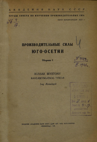Труды Совета по изучению производительных сил. Серия Закавказская. Вып. 2 : Производительные силы Юго-Осетии. Сб. 1.- Ленинград : Акад. наук СССР, 1931