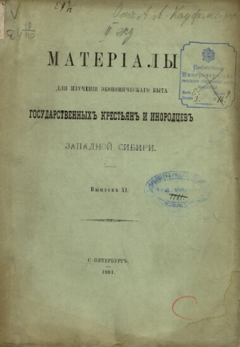 Материалы для изучения экономического быта государственных крестьян и инородцев Западной Сибири. Вып. 11 : Экономический быт государственных крестьян и оседлых инородцев Туринского округа Тобольской губернии. Ч. 1, Отд. 2. / иссл. А. А. Кауфмана. - С.-Петербург : Тип. В. Безобразова и Комп., 1891