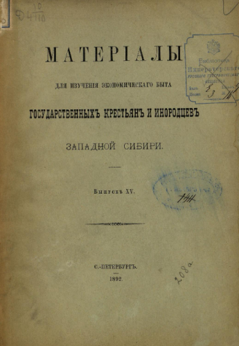 Материалы для изучения экономического быта государственных крестьян и инородцев Западной Сибири. Вып. 15 : Экономический быт государственных крестьян и оседлых инородцев юго-западной части Томского округа Томской губернии