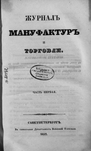 Журнал мануфактур и торговли. 1852, № 1. - Санкт-Петербург, 1852