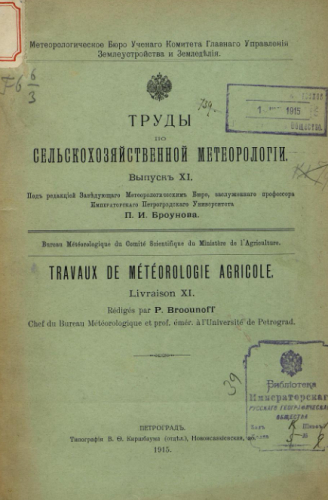 Труды по сельскохозяйственной метеорологии. Вып. 11. - Петроград: Метеобюро Ученого комитета Глав. упр. землеустр. и земледелия, 1915