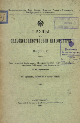 Труды по сельскохозяйственной метеорологии. Вып. 5. - Санкт-Петербург: Метеобюро Ученого комитета Глав. упр. землеустр. и земледелия, 1909