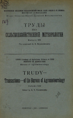 Труды по сельскохозяйственной метеорологии. Вып. 21. - Ленинград: ВАСХНИЛ, 1930