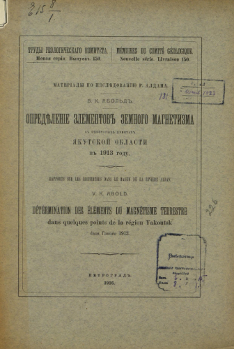 Труды Геологического комитета. Новая серия. Вып. 150 : Определение элементов земного магнетизма в некоторых пунктах Якутской области в 1913 году / В.К. Абольд. - Петроград, 1916