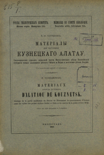 Труды Геологического комитета. Новая серия. Вып. 145 : Материалы для тектоники Кузнецкого Алатау / А.Н. Чураков - Петроград, 1916