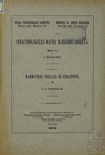 Труды Геологического комитета. Новая серия. Вып. 137 : Севастопольская фауна млекопитающих. Вып. 2 / А. Борисяк. - Петроград, 1915