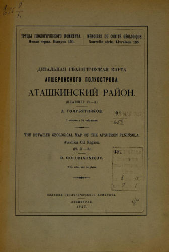 Труды Геологического комитета. Новая серия. Вып. 130 : Детальная геологическая карта Апшеронского полуострова. Аташкинский район / Д. Голубятников. - Ленинград, 1927