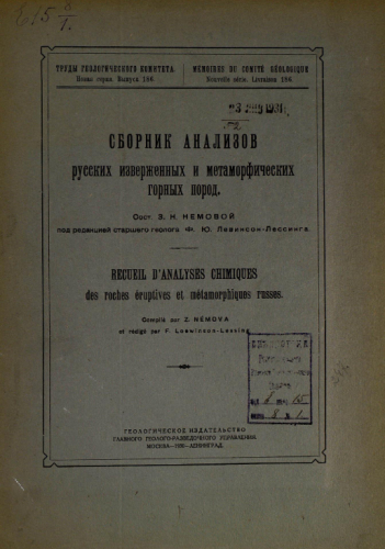 Труды Геологического комитета. Новая серия. Вып. 186 : Сборник анализов русских изверженных и метаморфических горных пород / сост. З.Н. Немова - М. ; Л., 1930