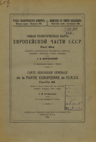 Труды Геологического комитета. Новая серия. Вып. 166 : Общая геологическая карта Европейской части СССР. Лист 44-й : Северо-западная четверть листа. Смоленск - Дорогобуж - Ельня - Рославль / А.М. Жирмунский - Ленинград, 1928