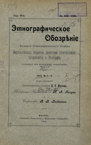 Этнографическое обозрение. 1912, № 1-2. - М. : Этнографический отдел Императорского Общества любителей естествознания, антропологии и этнографии, состоящего при Московском университете, 1912