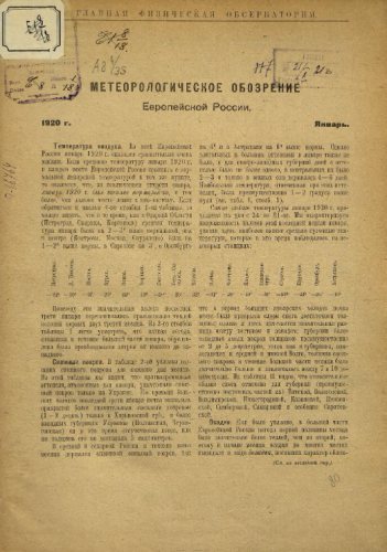 Метеорологическое обозрение Европейской России. Январь, 1920