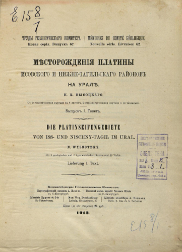 Труды Геологического комитета. Новая серия. Вып. 62 : Месторождения платины Исовского и Нижне-Тагильского районов на Урале. Вып. 1 / Н.К. Высоцкий - Санкт-Петербург, 1913