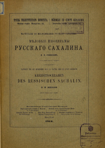 Труды Геологического комитета. Новая серия. Вып. 83 : Меловые иноцерамы Русского Сахалина / Д.В. Соколов - Санкт-Петербург, 1914