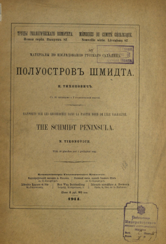 Труды Геологического комитета. Новая серия. Вып. 82 : Материалы по исследованию Русского Сахалина. Полуостров Шмидта / Н. Тихонович - Санкт-Петербург, 1914