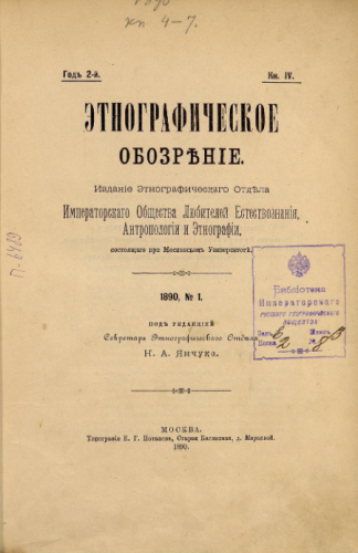 Этнографическое обозрение. 1890, № 1. - М. : Этнографический отдел Императорского Общества любителей естествознания, антропологии и этнографии, состоящего при Московском университете, 1890