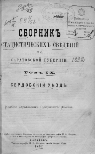 Сборник статистических сведений по Саратовской губернии. Т. 9 : Сердобский уезд. - Саратов : Саратов. губ. земство, 1892