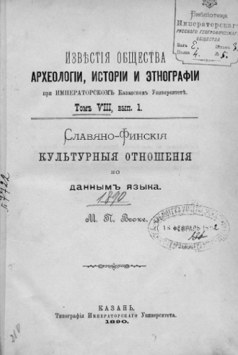 Известия Общества археологии, истории и этнографии при Имп. Казанском ун-те. Т. 8, Вып. 1 : Славяно-финские культурные отношения по данным языка / М.П. Веске - Казань, 1890
