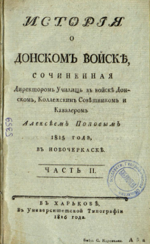 Попов, Алексей Григорьевич (1764 - 1844). История о Донском войске. Ч. 2. / Соч. директором училищ в войске Донском, коллежским советником и кавалером Алексеем Поповым 1812 года, в Новочеркасске. - Харьков : Универ. тип., 1816