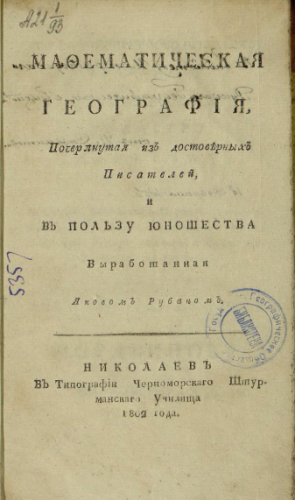 Рубан, Яков Андреевич (ок. 1760-1805). Математическая география / почерпнутая из достоверных писателей и в пользу юношества выработанная Яковом Рубаном. - Николаев : В тип. Черноморского штурманского училища, 1802