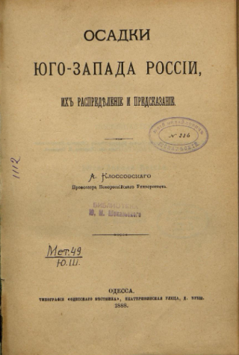 Клоссовский, Александр Викентьевич (1846-1917). Осадки Юго-Запада России, их распределение и предсказание / [соч.] А. Клоссовского, проф. Новорос. ун-та. - Одесса : Тип. "Одес. вестника", 1888