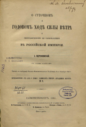 Керсновский, Иосиф Аполлинариевич. О суточном и годовом ходе силы ветра и географическом ее распределении в Российской империи : чит. в заседании Физ.-мат. отде. 9 окт. 1890 г / И. Керсновский. - Санкт-Петербург : Тип. Имп. Акад. наук, 1891