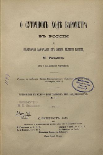 Рыкачев, Михаил Александрович (1840-1919). О суточном ходе барометра в России и некоторые замечания об этом явлении вообще / [соч.] М. Рыкачева. - Санкт-Петербург : Тип. Акад. наук, 1879