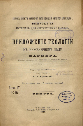 Вагнер, К.И. Приложение геологии к инженерному делу / [Соч.] Вагнера, гл. инж. при постройке Арльберг. туннеля ; пер. с нем. под ред. И.В. Мушкетова. - Санкт-Петербург : Тип. Ю.Н. Эрлих, 1887 - (Сборник Института инженеров путей сообщения. Материалы для институтских курсов. Вып. 11)