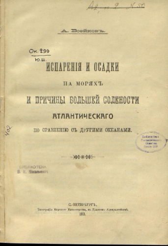 Воейков, Александр Иванович (1842-1916). Испарения и осадки на морях и причины большой солености Атлантического по сравнению с другими океанами / А. Воейков. - Санкт-Петербург : Тип. Мор. м-ва, 1913