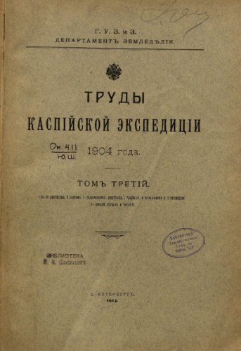 Труды Каспийской экспедиции 1904 года. Т. 3 : Журнал гидрологических и метеорологических наблюдений Каспийской экспедиции 1904 г. / [Соч.] ст. специалиста по рыбоводству при Деп. земледелия А.А. Лебединцева. - Петроград : Г.У.З. и З. Деп. земледелия, 1913