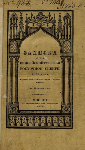Пестов, Иван Семенович. Записки об Енисейской губернии Восточной Сибири, 1831 года / сост. статским советником И. Пестовым. - Москва : Унив. тип., 1833
