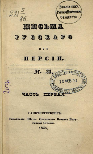 Масальский, Николай Федорович (1812-1880). Письма русского из Персии. Ч. 1. / Н.М. - Санкт-Петербург : Тип. Штаба Отдельного корпуса внутренней стражи, 1844