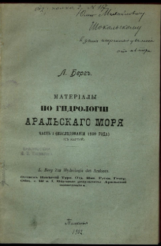 Берг, Лев Семенович (1876-1950). Материалы по гидрологии Аральского моря. Ч. 1 : (Исслед. 1900 г.) / Л.С. Берг. - Ташкент, 1902