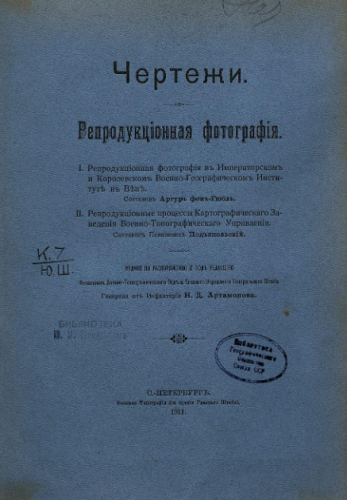 Репродукционная фотография : Чертежи / изд. по распор. и под ред. нач. Воен.-топогр. отд. Гл. упр. Ген. штаба ген. от инфантерии Н.Д. Артамонова. - Санкт-Петербург : Воен. тип., 1911