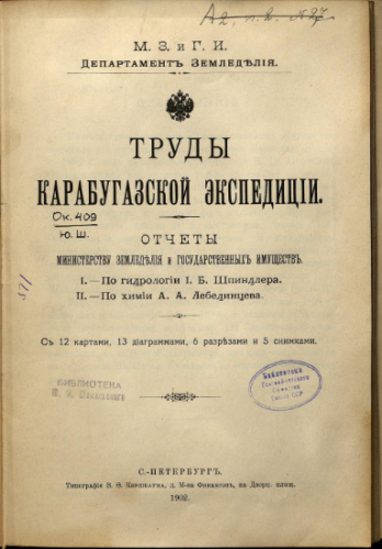 Труды Карабугазской экспедиции : Отчеты Мин-ву земледелия и гос. имущ. 1. По гидрологии / И.Б. Шпиндлера. 2. По химии / А.А. Лебединцева. - Санкт-Петербург : М.З.иГ.И. Деп. земледелия, 1902